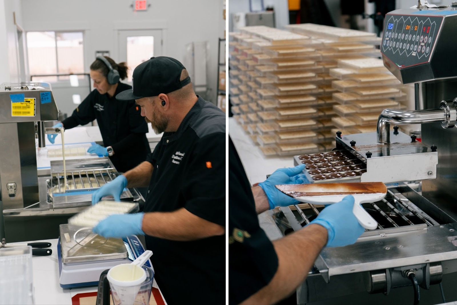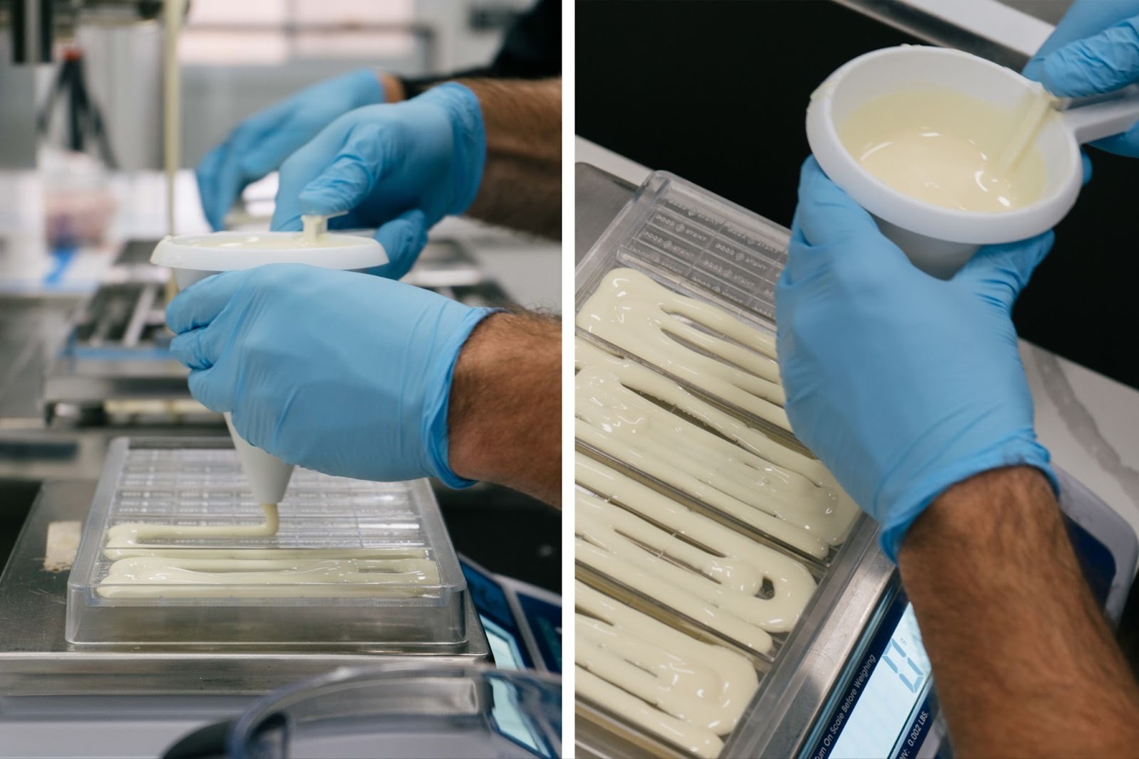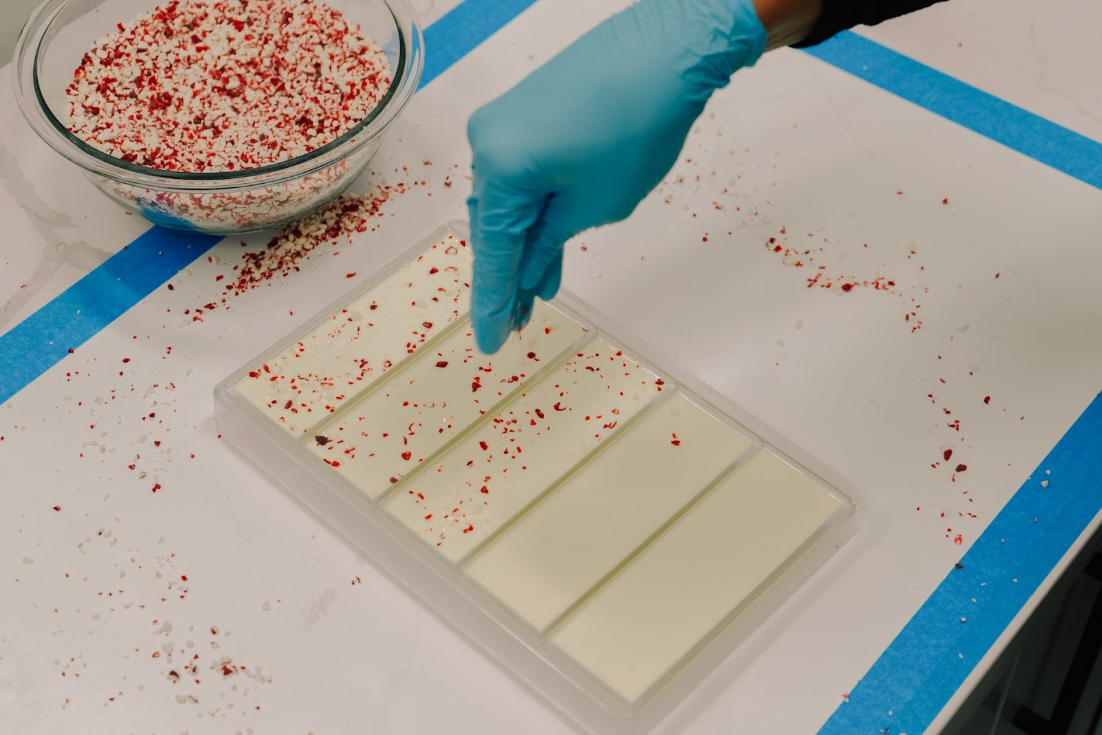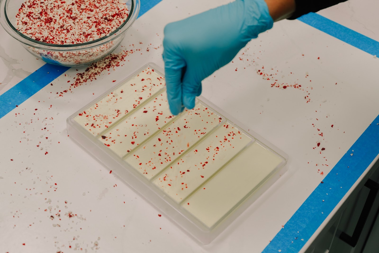 Rob pours and weighs the white chocolate into molds, sets them onto the vibration plate so the chocolate distributes evenly, and then Mindy sprinkles crushed peppermint over the top like the final snowfall of a perfect storm day.