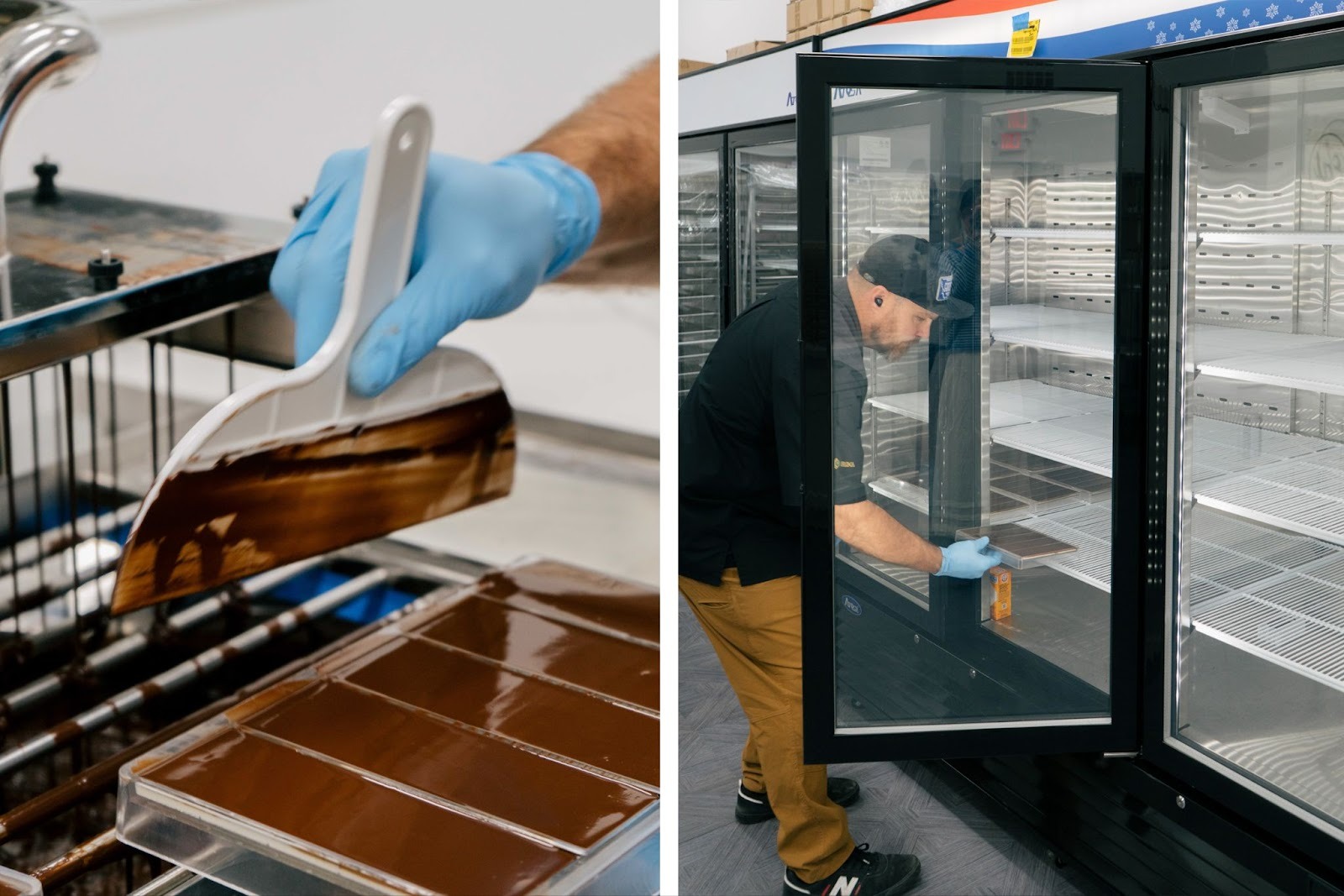 The next morning, a layer of regular (or dark) chocolate is poured over the peppermint-white-chocolate base. Excess chocolate is scraped level, smoothed out again on the vibration plate, and then chilled until fully set.
